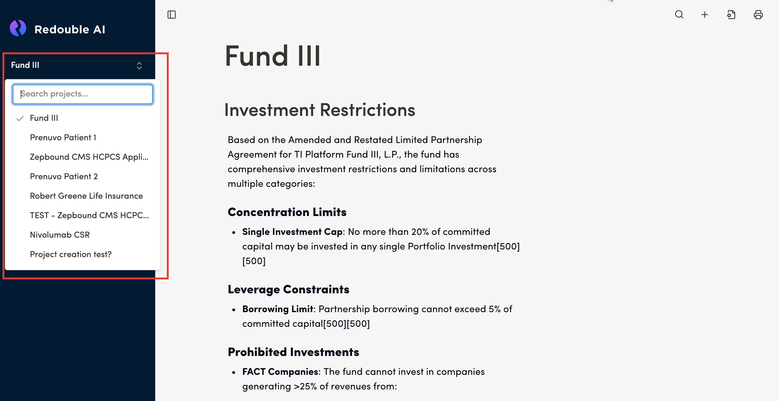The project list is displayed in order of last use or creation. The current active project is marked in the list.