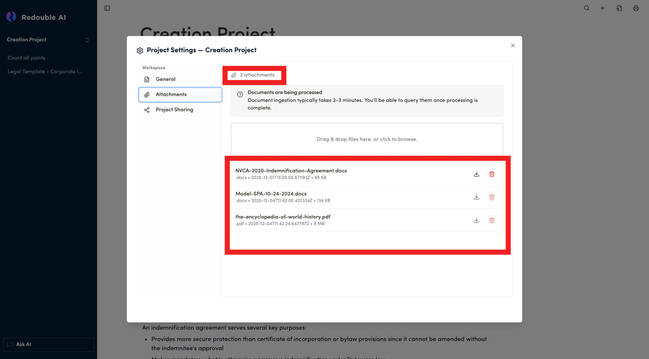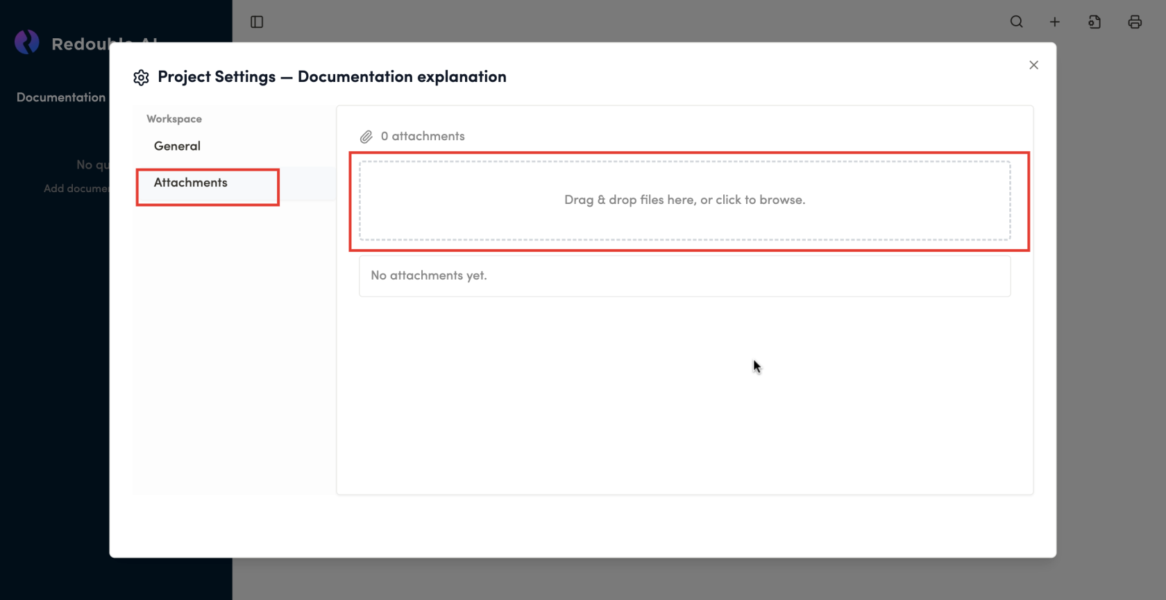 In the dialog window, select "Attachments" in the "Workspace" list, click on the field to select files from your computer or drag files and documents directly into the field