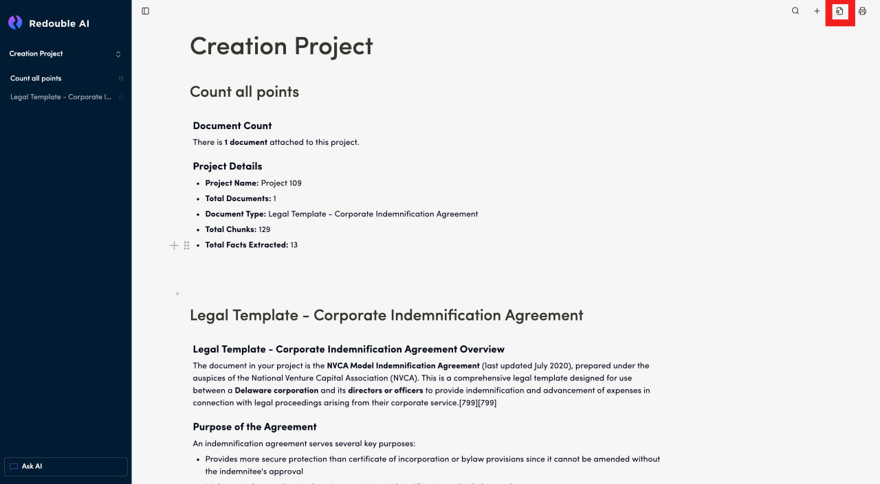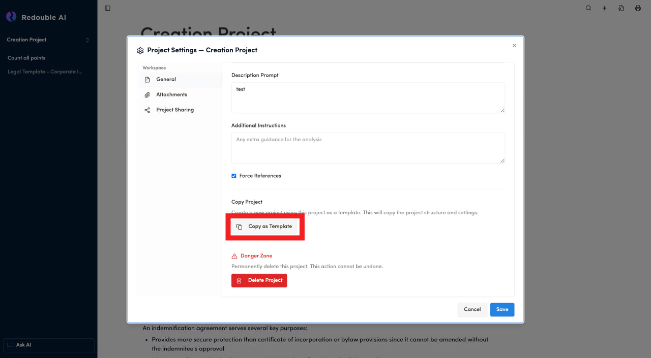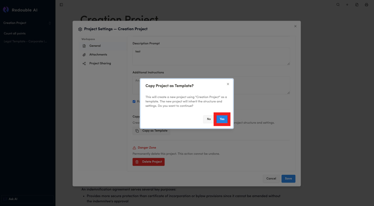 Purpose: Create a new project using an existing project as a template, copying the project structure and settings without duplicating input documents or answers.