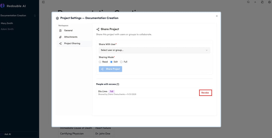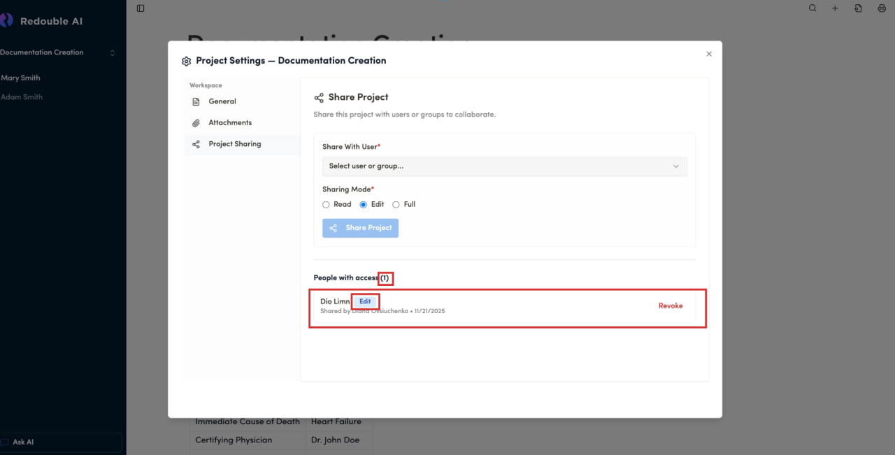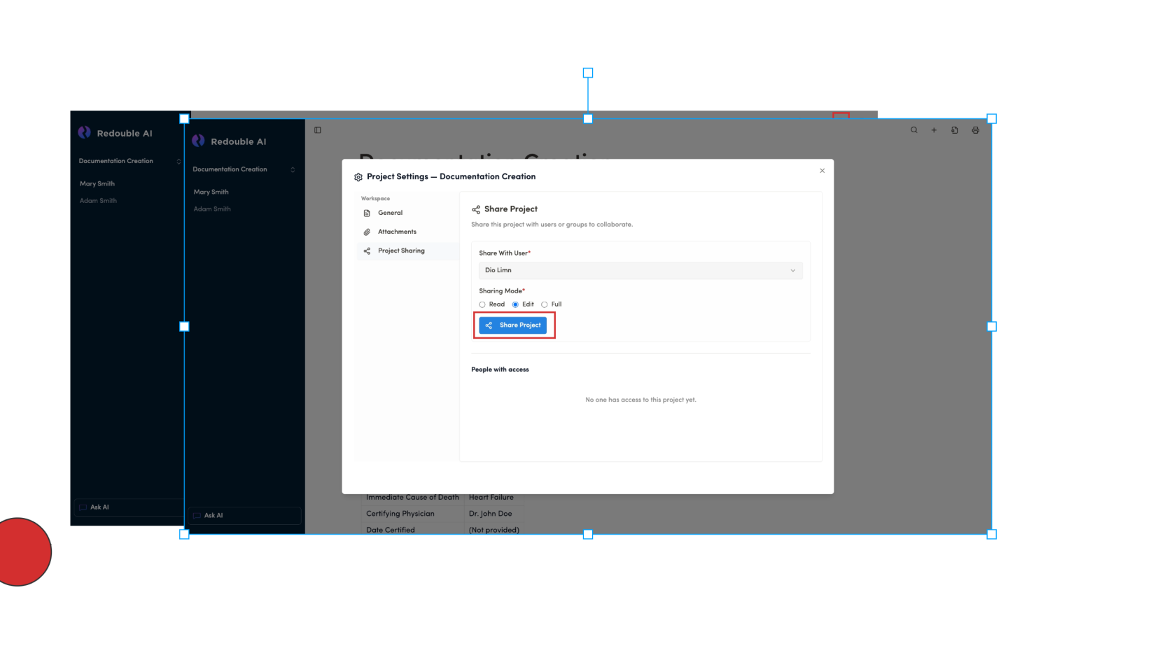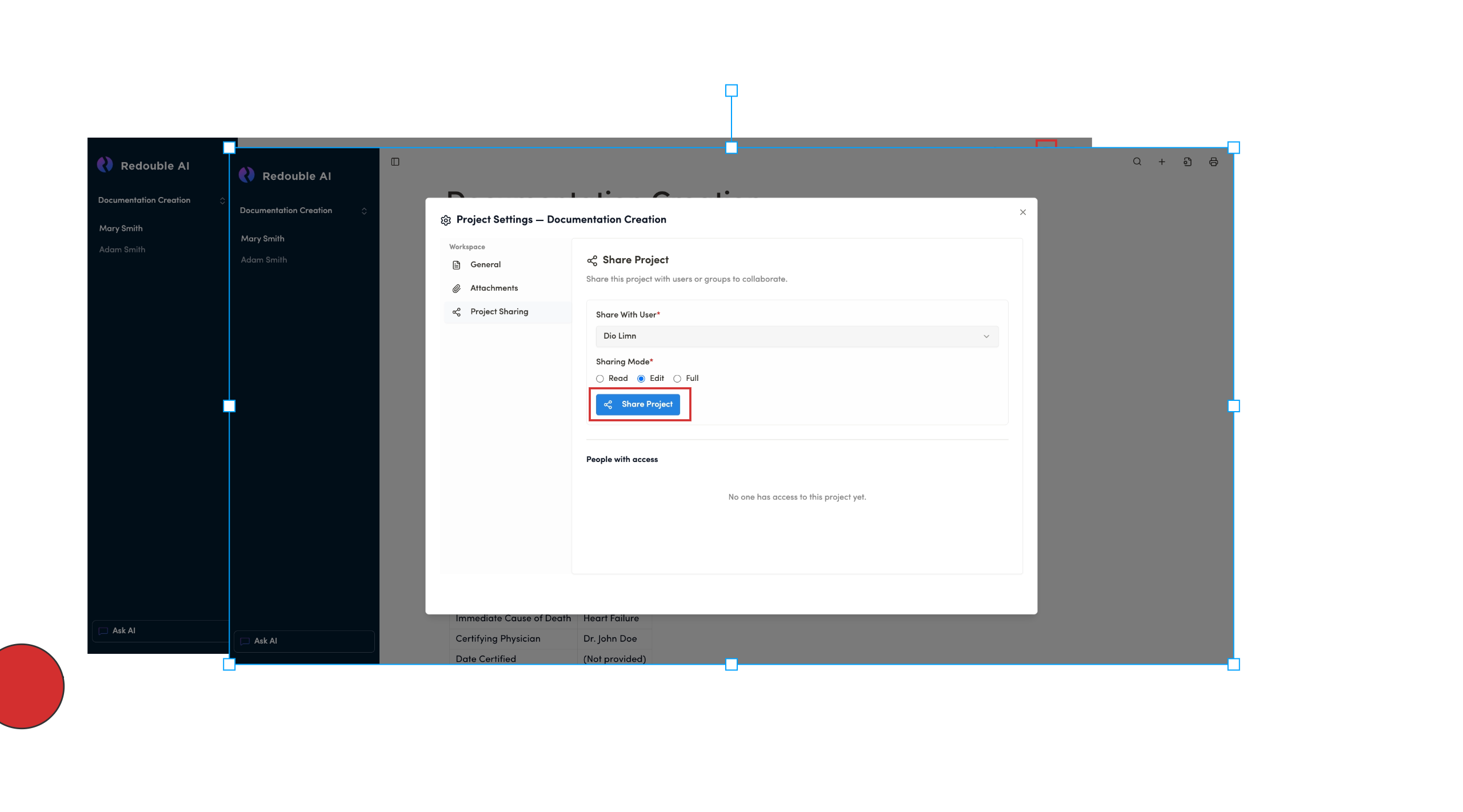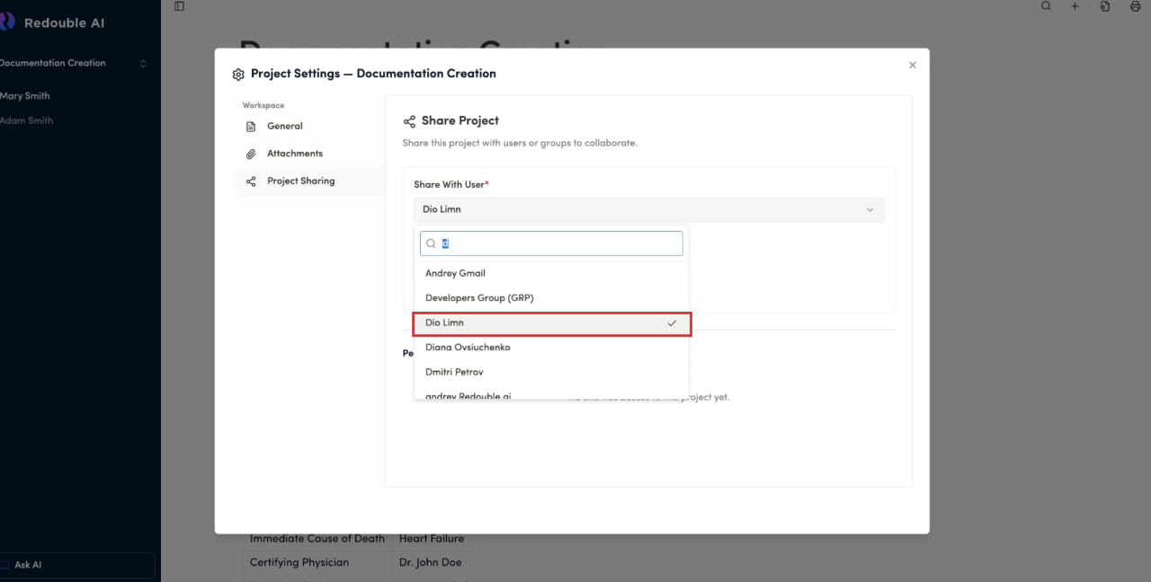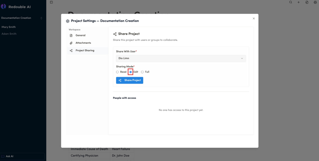 2. In the dialog window, select "Project sharing" in the "Workspace" list