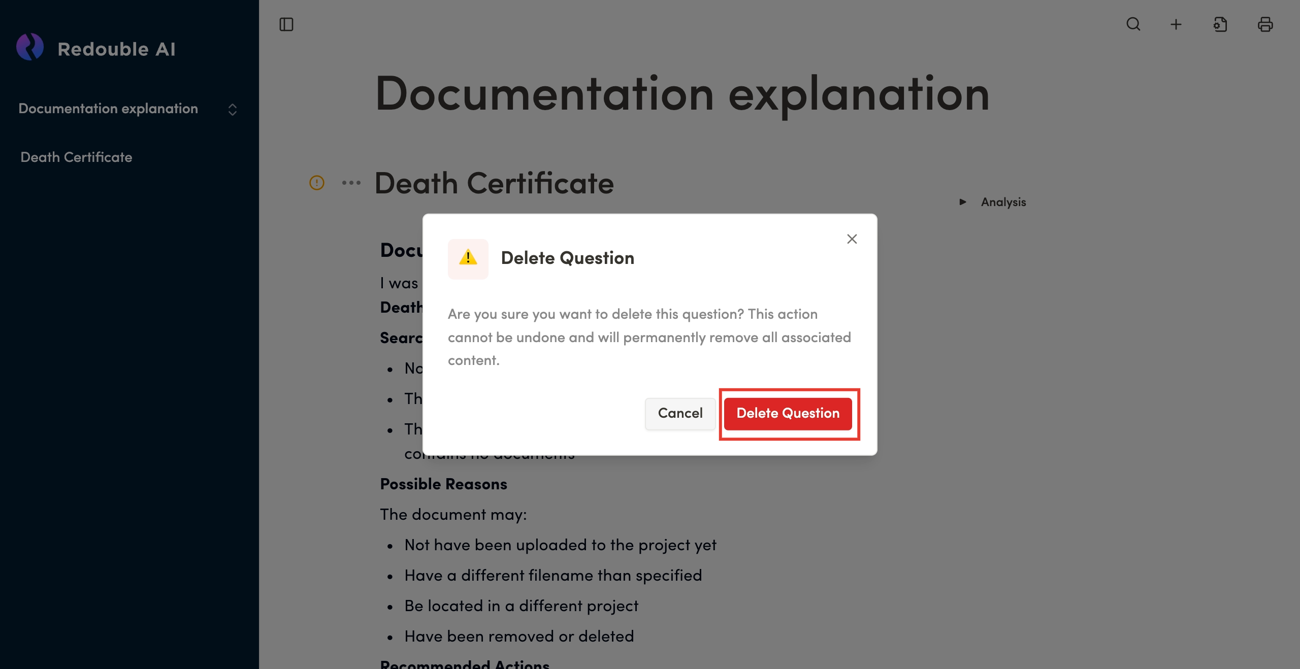 Result: The question is deleted from the project. It is no longer displayed at the project dropdown list.