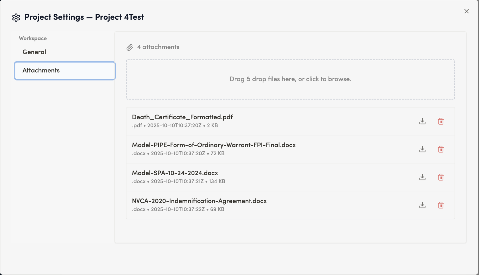 The Attachments tab manages all documents available for AI analysis within the project. You can also upload new documents here.