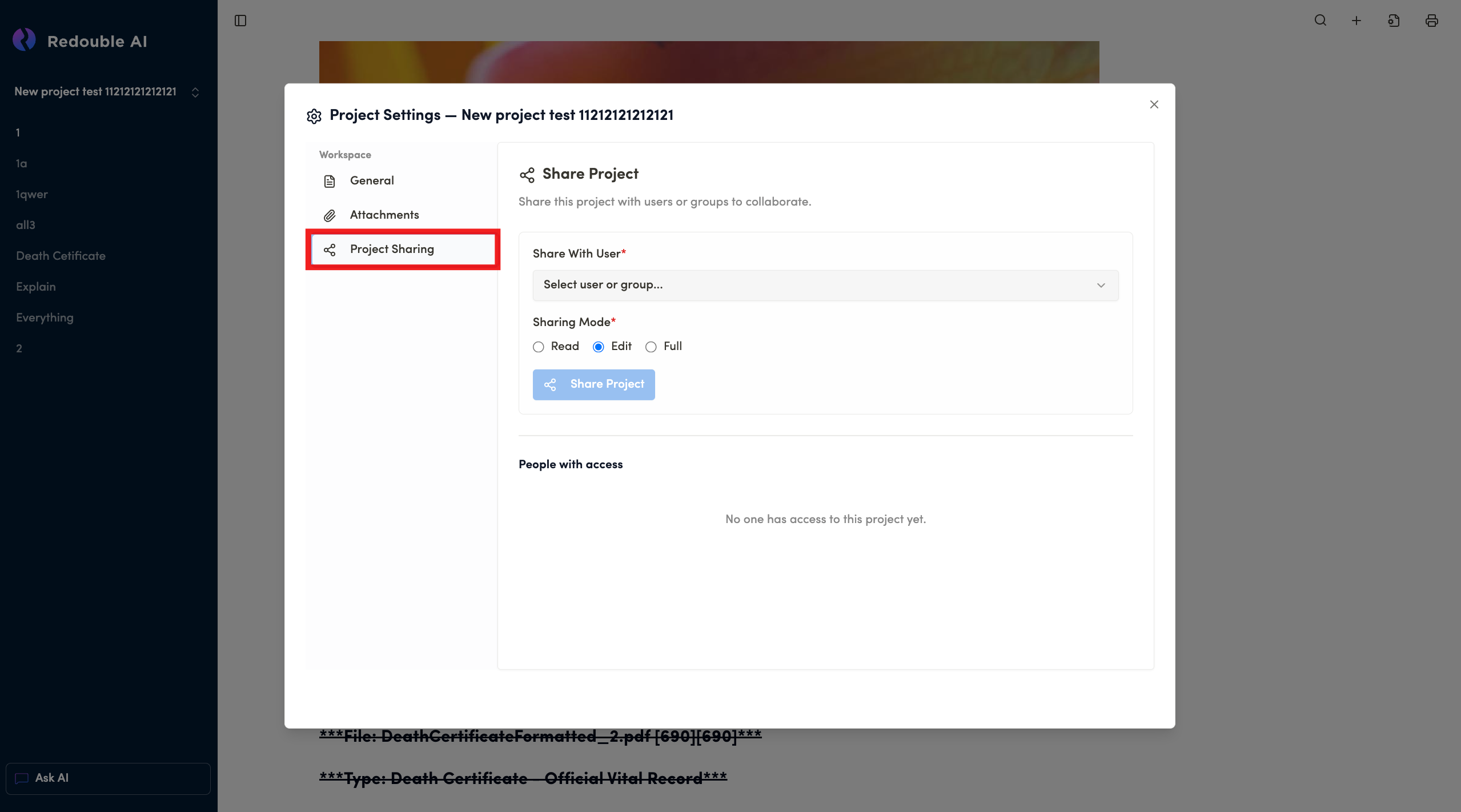 • Edit - Can view and modify project content (currently selected in your screenshot)