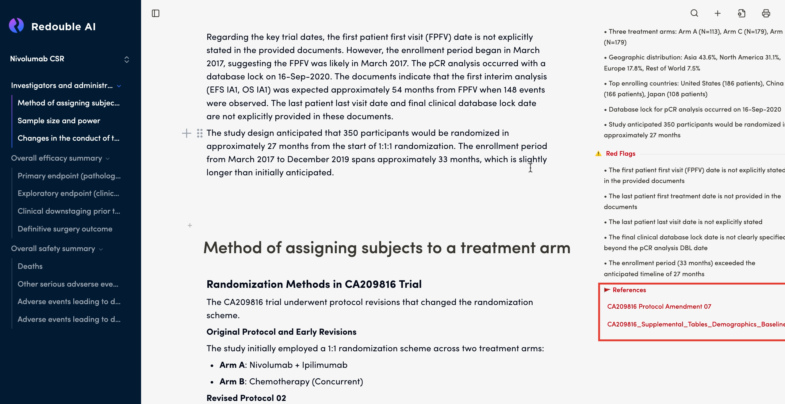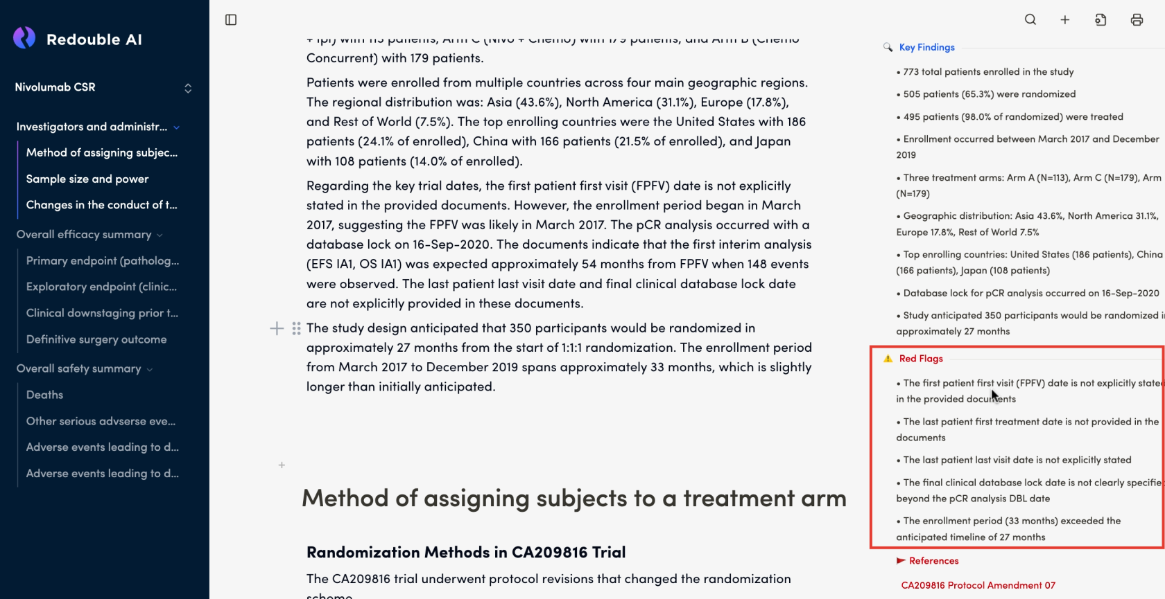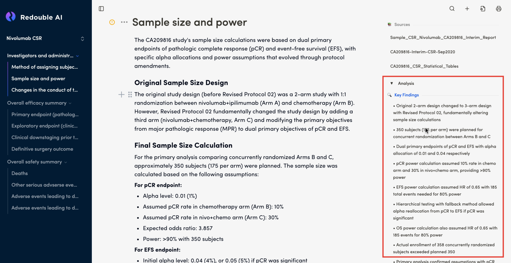 Purpose: The Analysis Section, shown on the right-hand side of the user interface, is a feature of the Redouble AI system that provides a short summary of the key points of the AI-generated response (Key Findings) and alerts the user to potential contradictions and discrepancies that the AI has spotted (Red Flags).