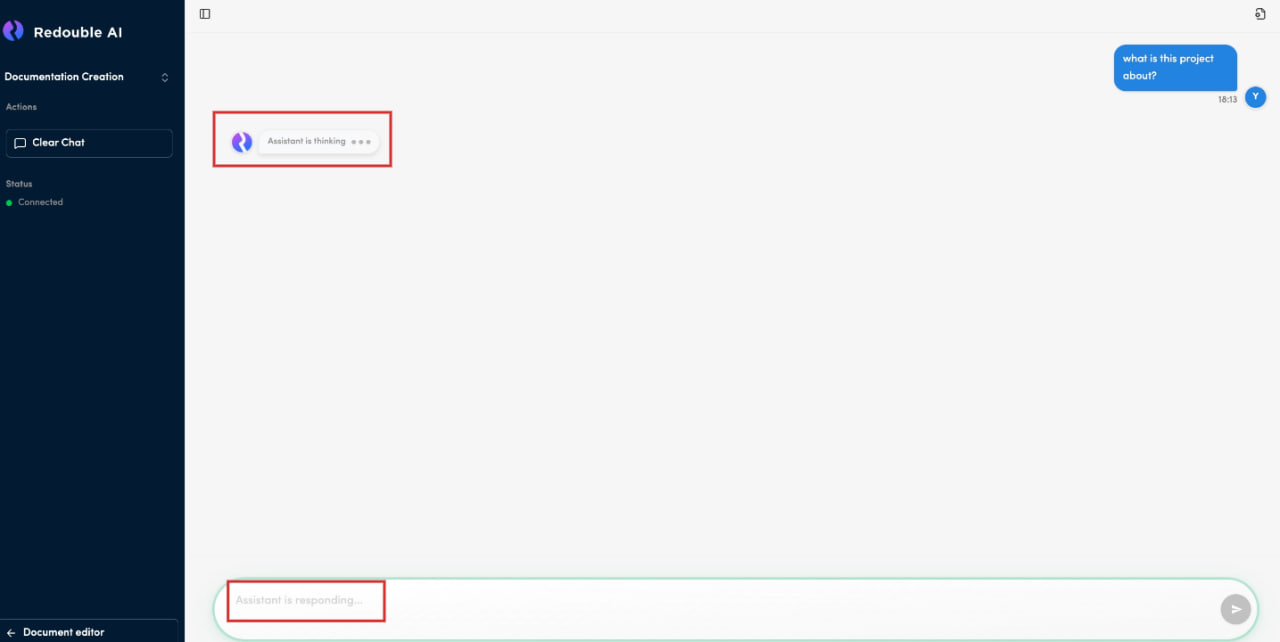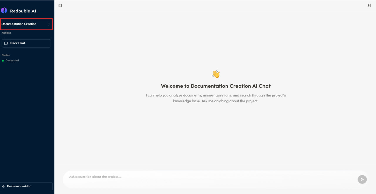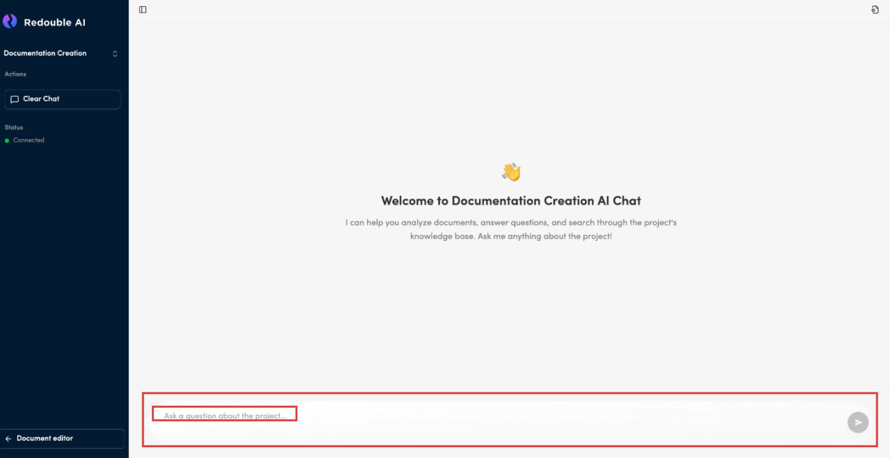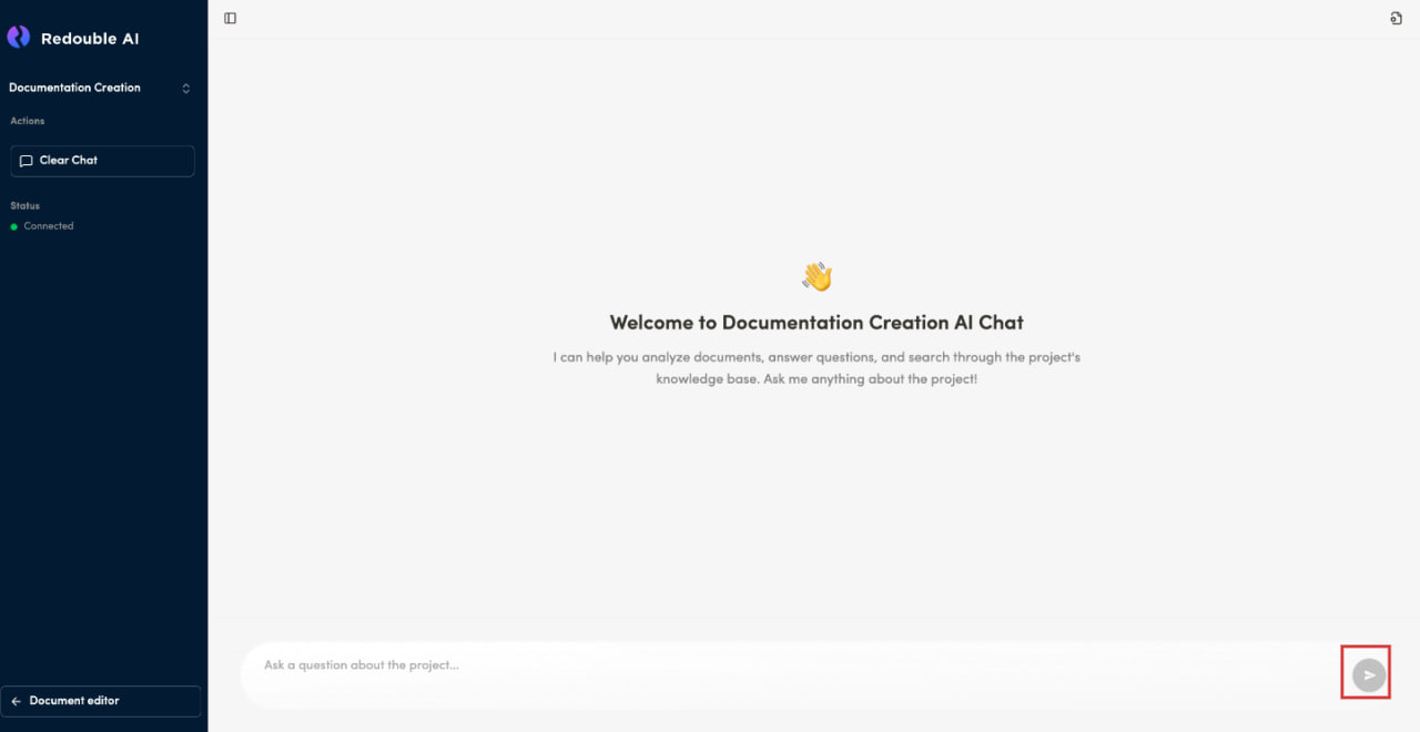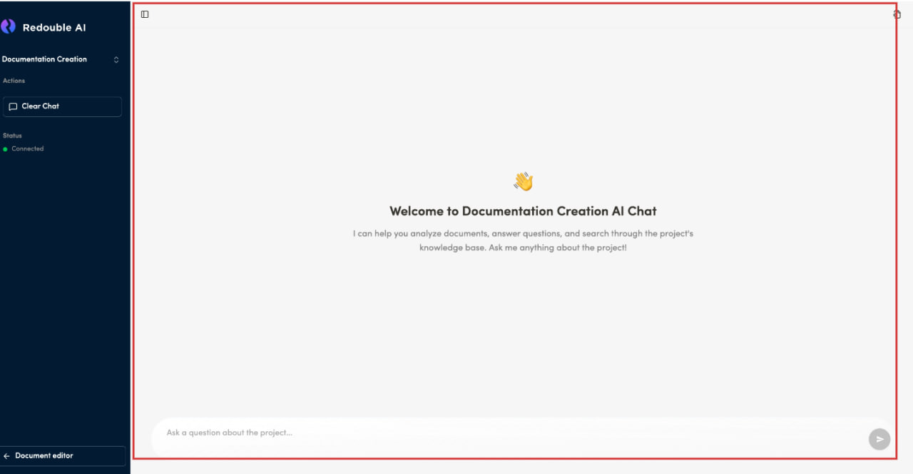 Conversation Display - shows messages between user and AI. When there is no messages, it should have text: "Welcome to Documentation Creation AI Chat