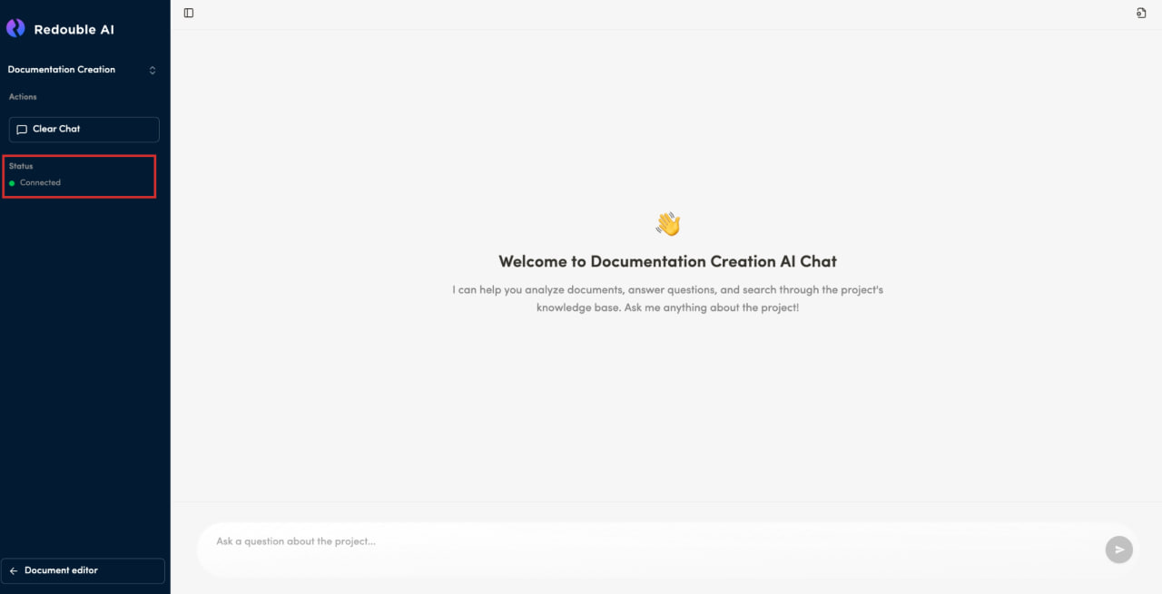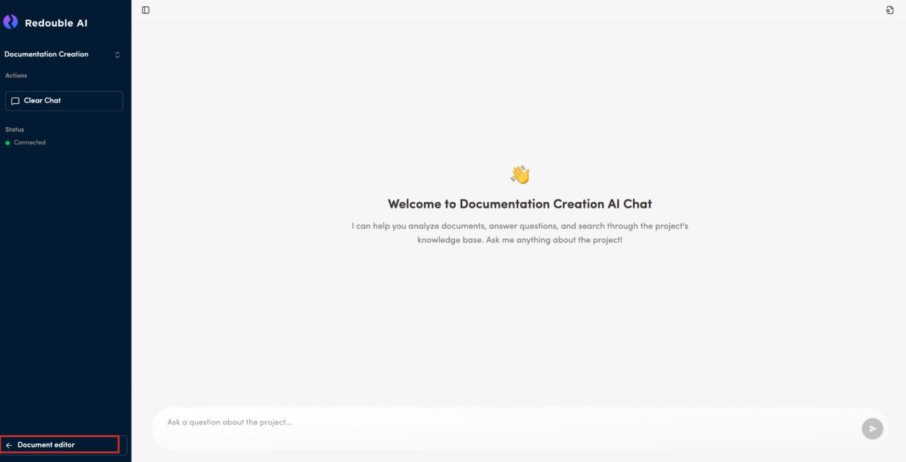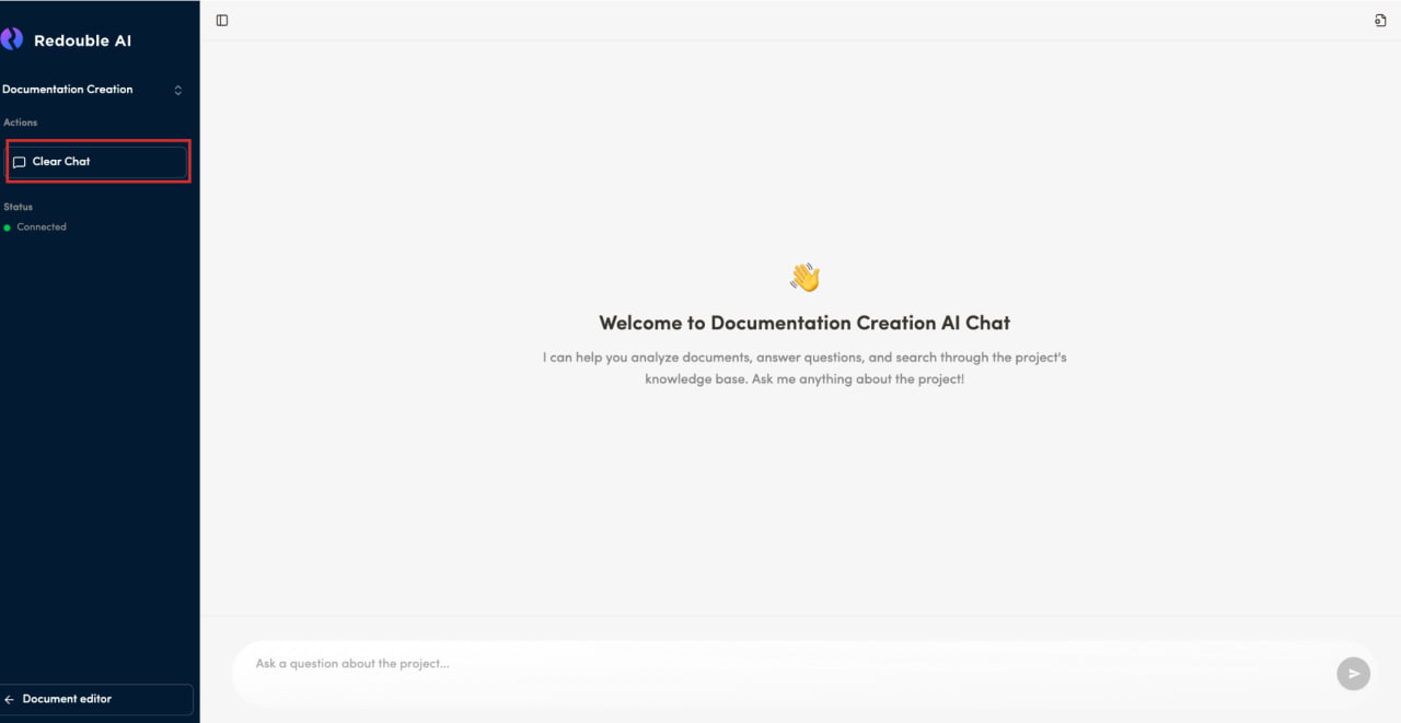 Purpose : A conversational interface to interact with the AI assistant about your project Access: You can access the chat from the project page by clicking "Ask AI" button