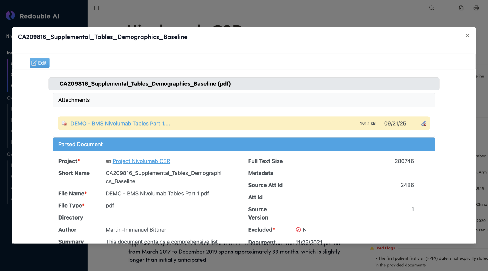 The Document Details View provides comprehensive information about uploaded documents, including metadata, parsing results, attachments, and version history.